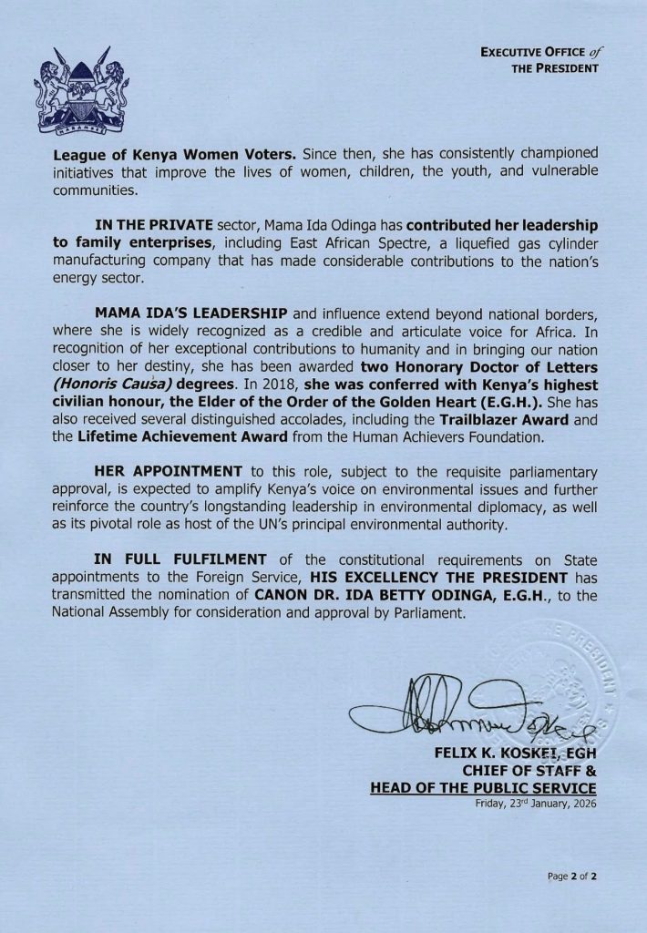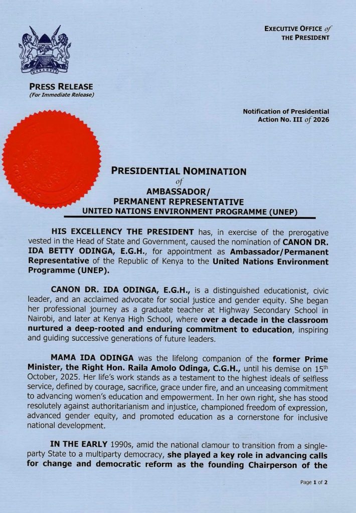 H.E. President William Samoei Ruto has nominated Canon Dr. Ida Betty Odinga, EGH as the Ambassador/Permanent Representative of the Republic of Kenya to United Nations Environment Programme (UNEP).