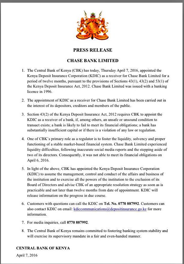 CBK said at the time that the bank was experiencing serious liquidity and capital deficiencies, raising concerns that it was unlikely to meet its financial obligation.