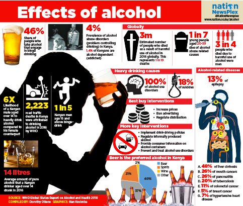 Four out of every 100 people who lost their lives in Kenya in 2016 did so as a result of alcohol abuse, says a report released by the World Health Organisation on Friday. PHOTO | FILE