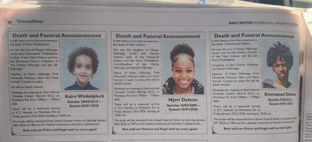 A Memorial Service for Njeri DeLeon, Emmanuel DeLeon, and Kairu Winkelpleck will be held on Friday, January 23rd, 2026, at International Christian Center (ICC), Nairobi (Mombasa Road) at 10:00 a.m.