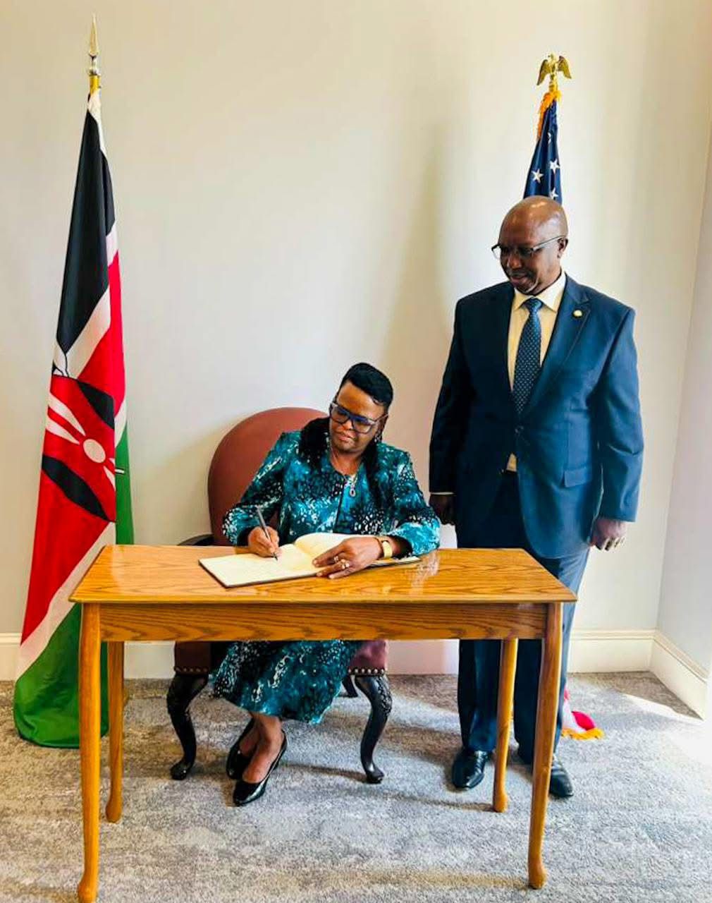 Hon. Chief Justice Martha Koome, President of the Supreme Court of Kenya, paid a courtesy call at the Embassy of the Republic of Kenya in Washington, D.C. She was accompanied by Judges of the Supreme Court, the Court of Appeal, and judicial officials who are in the United States on official duty. H.E. David Kerich welcomed the delegation and underscored the complex judicial landscape involving multiple actors across both Kenya and the United States. He emphasized the importance of structured engagement, institutional coordination, and adherence to respective legal frameworks in advancing effective judicial cooperation.