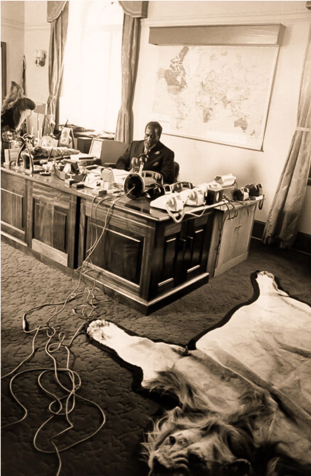 Mzee Jomo Kenyatta working in his office at State House Nairobi. The desk looks so cluttered with papers and six landline telephones.