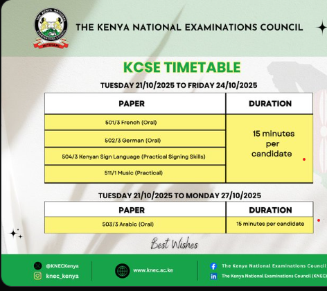 “The KCSE 2025 oral and practical examinations will be conducted from Tuesday, 21st October 2025 to Monday, 27th October 2025. Candidates and examination officials are required to strictly follow the scheduled dates,” the council stated.
