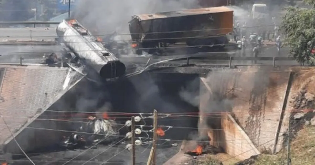 The crash occurred near the Carnivore Restaurant and Wilson Airport. According to witnesses, a lorry transporting flour had stalled on the climbing lane of the bypass. As traffic slowed, a fuel tanker attempted to pass the stationary vehicle, struck the pavement, and lost control before crashing into a bridge.