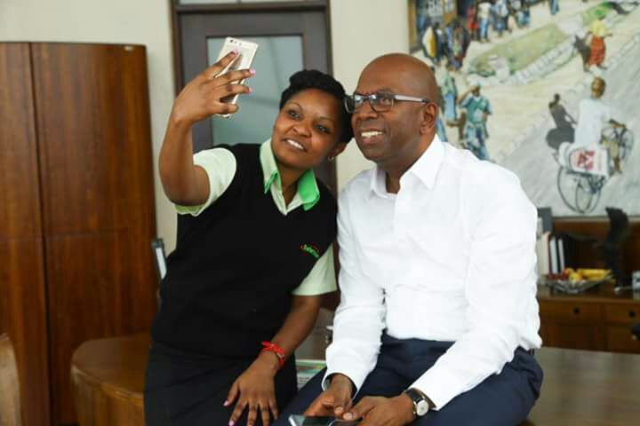 Safaricom CEO Bob Collymore in a meeting with Nakuru-based Safaricom attendant Pauline at the Safaricom offices in Nairobi, October 29, 2016. /COURTESY