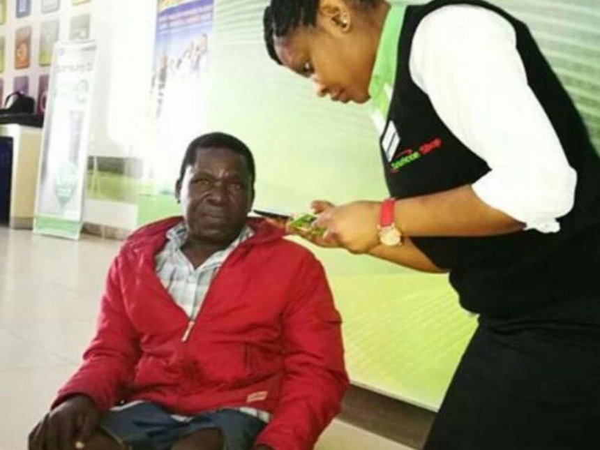 A picture of Safaricom attendant Pauline Shalimo assisting William Kisumo at the Nakuru shop has been doing rounds on social media. /COURTESY