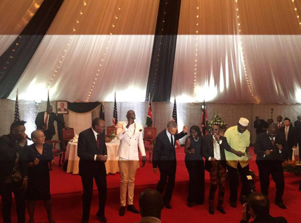 U.S. President Barack Obama let loose Saturday during a state dinner in Kenya. As singers serenaded the assembled dignitaries, Obama buttoned his jacket and joined in as they started to dance. Then the rest of the head table joined in for what became a line dance. A laughing Obama then hugged his half-sister, Auma Obama.